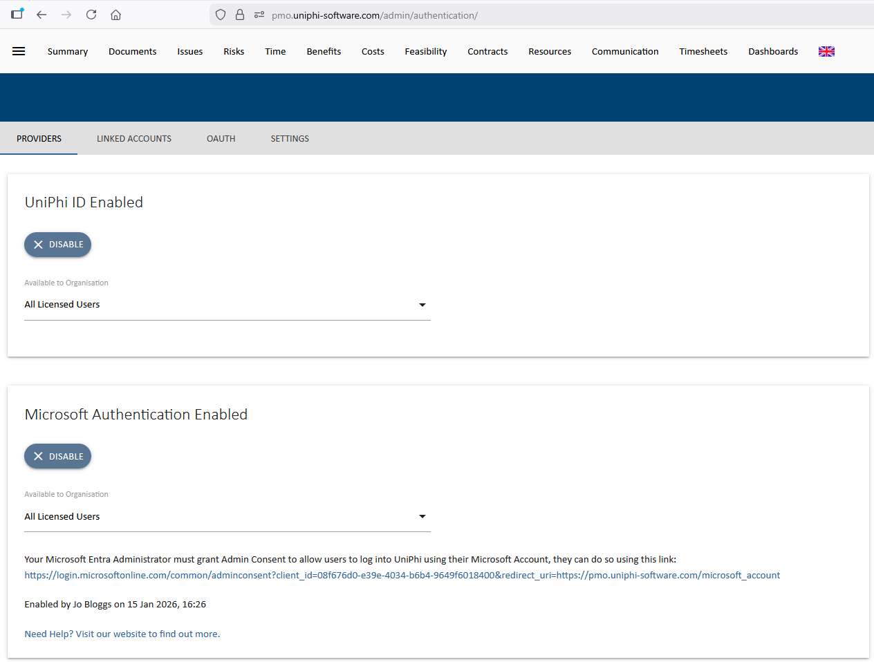 An Admin Consent link will be displayed on screen, your Microsoft Entra Administrator must follow this link and grant approval for users from your Organisation to log into UniPhi using their Microsoft Account.