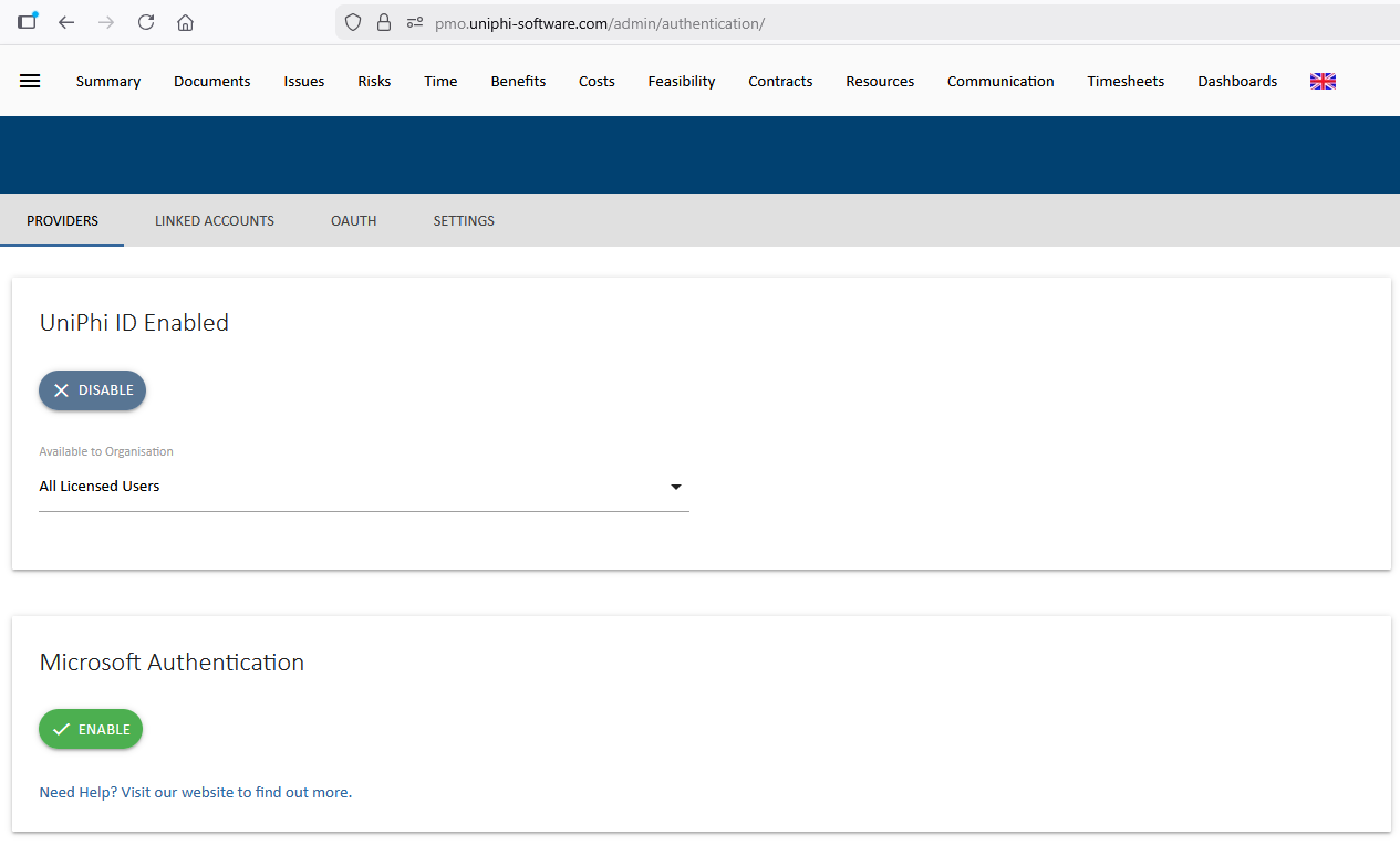 During the setup of a new UniPhi deployment, or as part of the upgrade to UniPhi v21, an App Registration is automatically created in the UniPhi Entra tenancy to support SSO. The name of the app registration will match the URL used to access UniPhi, eg: pmo.uniphi-software.com