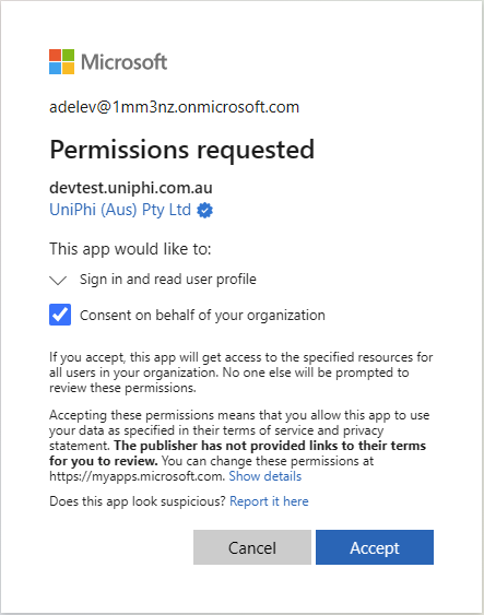 If you have users from different Organisations accessing your UniPhi deployment, then an Entra Administrator from each Organisation must grant their Admin Consent.